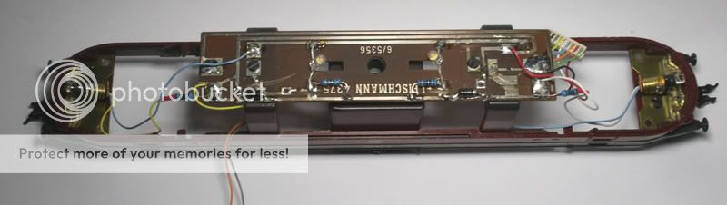 Remove all wiring and lamps from the circuit board , remove the lamps from the lamp holders at each end. Fleischmann use blue wire for one side of the pick-ups and black for the other. This locomotive has a driver in cab 2 so I thought to make that the normal forward direction. This makes the blue wire the right hand rail going forward.